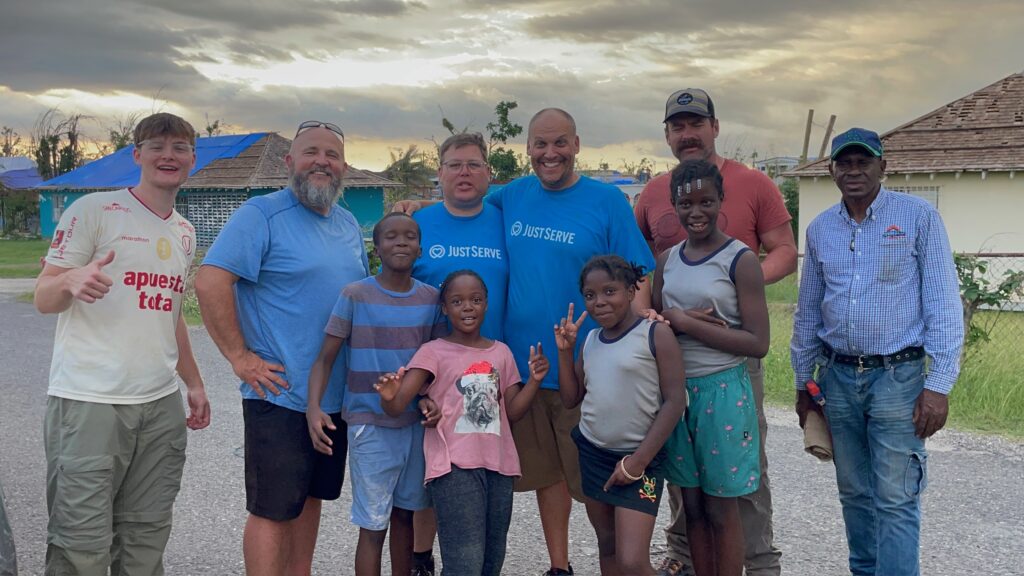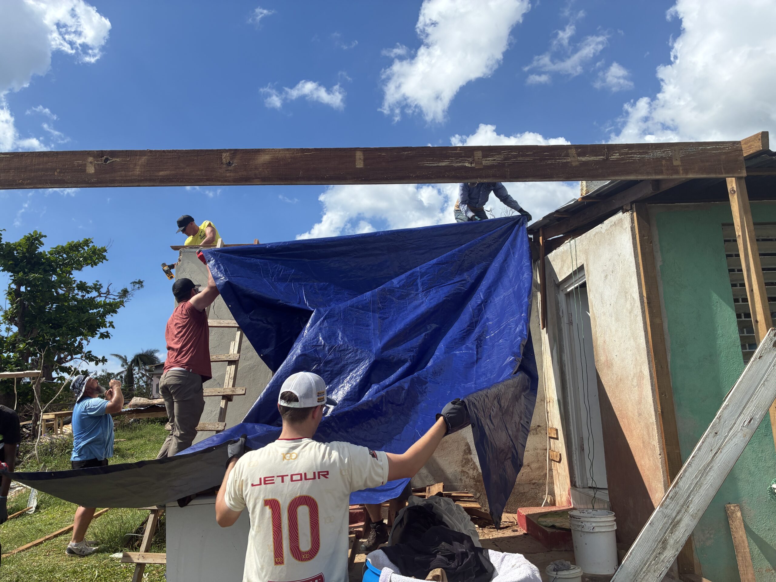 While driving back to drop off Auntie P, Johnson spotted an old woman sitting outside on a chair and said, “She needs help.” So we stopped and called out to her. The woman’s daughter came running out from the back, saying that they did need help. They had lost their roof and were still without power. We left her with some tarps, ropes, and water tablets. Brother Richardson and Anderson surveyed the roof and took some measurements, and Sister Morrison got her information and added them to a list.
