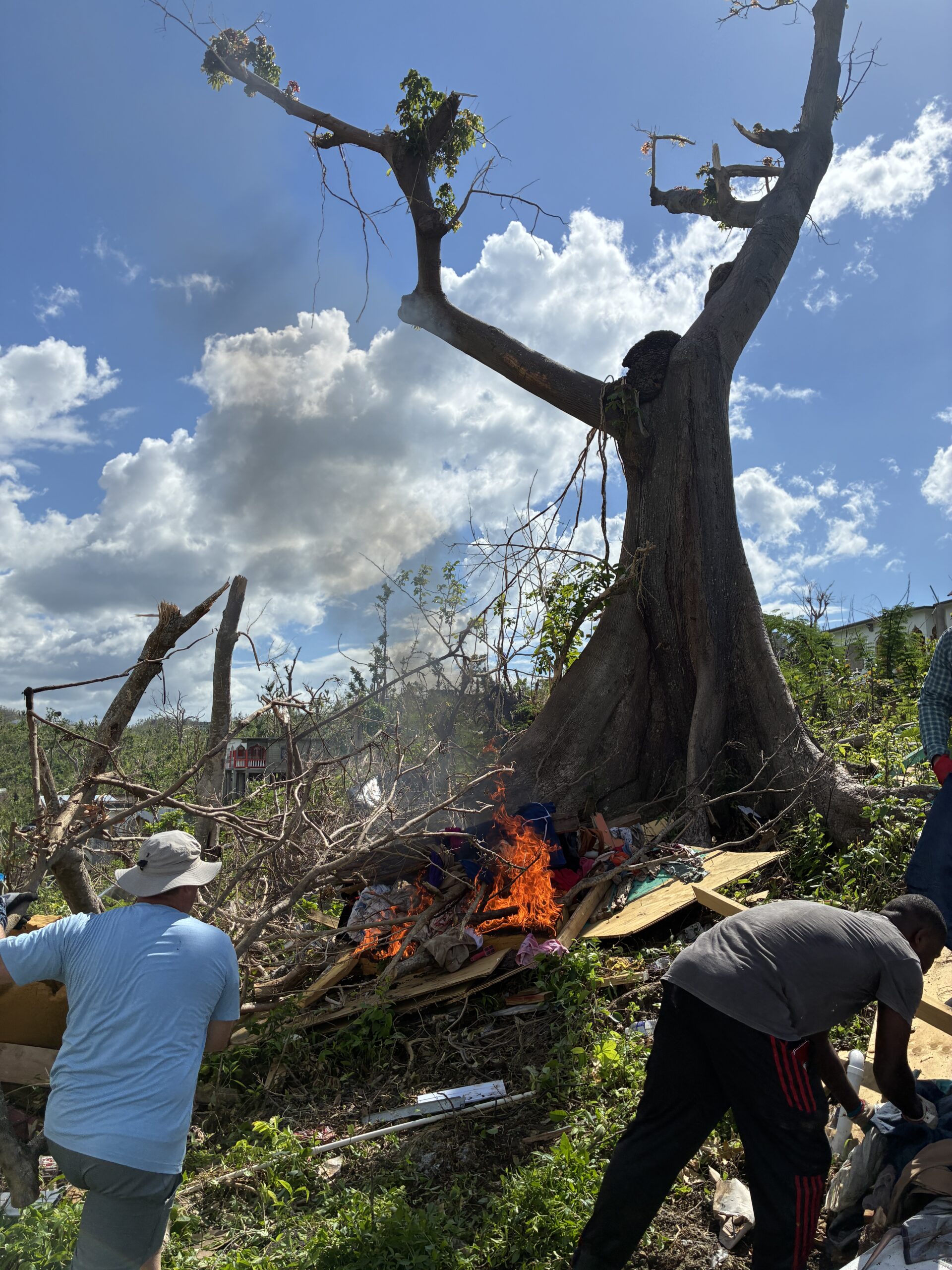 In Belmont, we saw the worst of the damage. Entire communities were leveled by Hurricane Melissa. Piles of wood, trash, household goods, clothes, and rotting food lay atop concrete slabs that used to be houses. We climbed up a hill to the place where Brother Witter’s mother’s home used to be. It was the first time we didn’t know what to do. The decimation was so vast and so complete that it felt paralyzing. After taking several minutes to survey the scene and take it all in, we got to work.