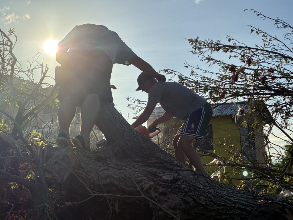 A man had begged gloves from Anderson early in the day, and he returned to ask if we could use the chainsaw to cut up a fallen tree for him. The blades of the chainsaw were dull by now, but Anderson agreed, and Johnson and I followed him deeper still into the breach. This was a massive tree and would have taken all day to cut up, even with a good chainsaw, and the sun was getting real low. Johnson and Anderson made short work of several of the larger branches, and then we called it.